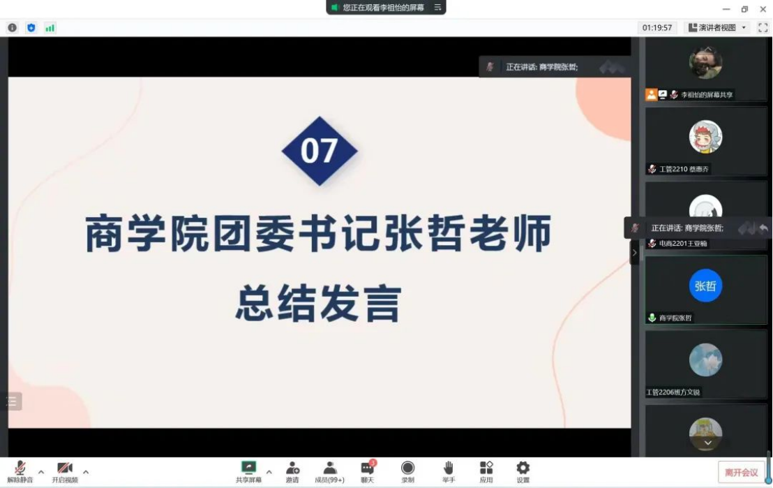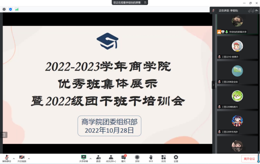 2022年10月28日19时,2022-2023学年bevictor伟德优秀班集体展示暨2022级团干班干培训会在线上召开。出席本次会议的嘉宾有:bevictor伟德党委副书记沈长霞、团委书记张哲,2022级辅导员王朕、向媛薇,团委副书记李祖怡,学生会执行主席纪晓夏,金融学院五届一任团委组织部负责人杨诗宁,bevictor伟德三届三任团委组织部负责人郭晓璠,四届一任团委组织部工作人员银长宇,2021级优秀班集体团支书徐紫慧,2022级级长代表梁思进。bevictor伟德2022级全体级委、各班团干班干参加培训会。