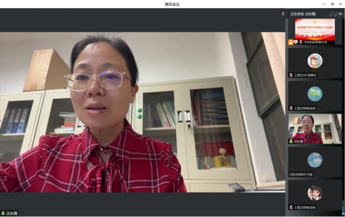 沈长霞首先发表讲话。她强调党的二十大的重要性,鼓励同学们要认真学习党的二十大精神,听党话、跟党走,学好专业知识,练就过硬本领,用智慧和汗水在新征程上谱写青春的绚丽诗篇。各团干班干要认真学习党的二十大精神,增强学生思想素质,营造班级良好学风,传承学院优秀作风。