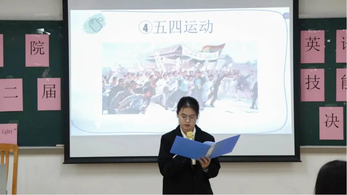 比赛第一个环节是关键词阐释。选手们根据抽取的关键词进行演讲,围绕“科教兴国”“红船精神”“平凡英雄”“五四运动”“冬奥会”五个方面向观众讲述中国精神。选手们根据新时代特色,并结合自己的理解,在五分钟内用流利的口语向大家讲述内涵丰富、鼓舞人心的中国精神。