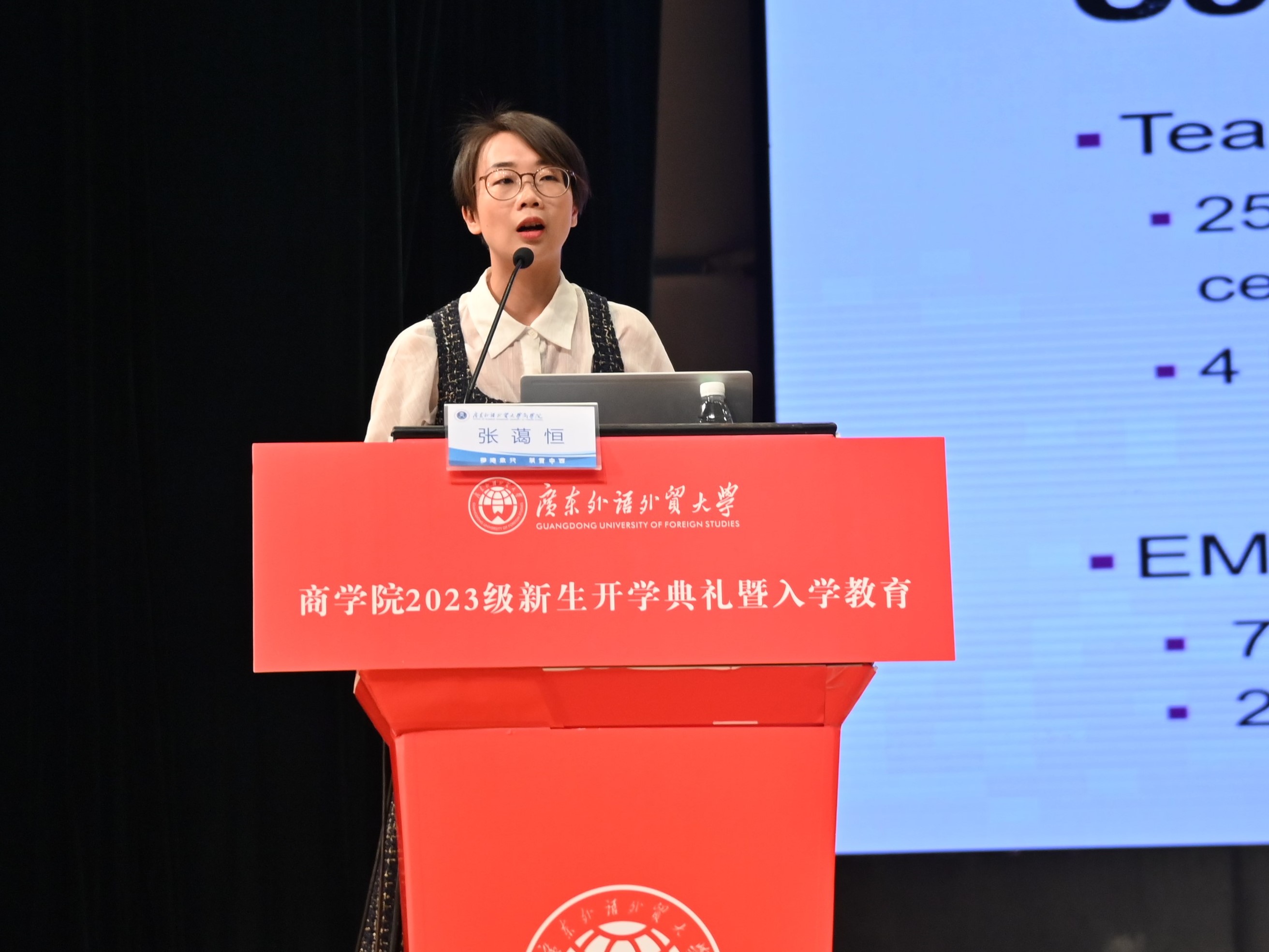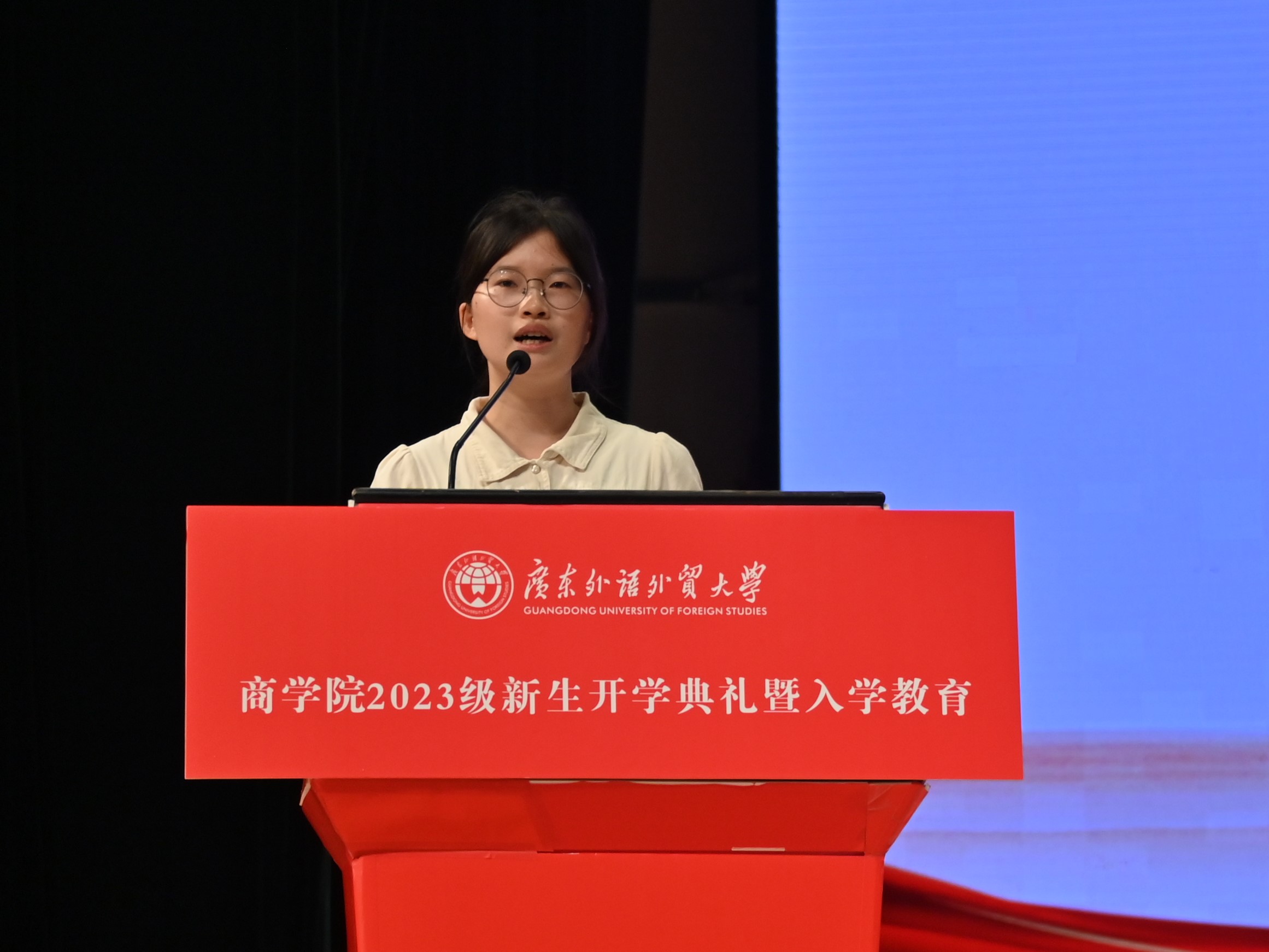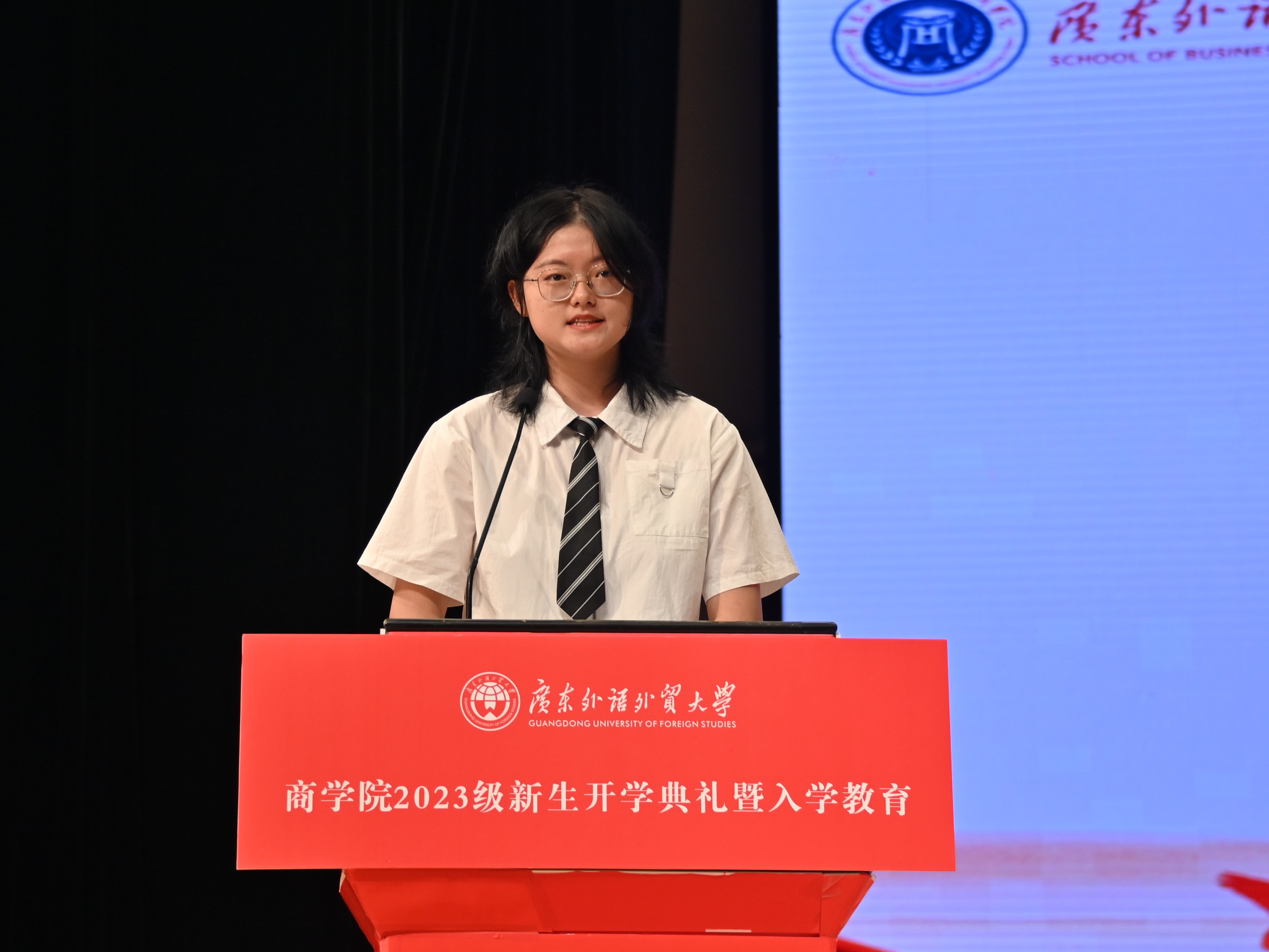 来自2023级工商管理(国际创新班)的新生代表许馨予在典礼上发言。她表达了对新生活新篇章的向往,呼吁同学们博学思想、笃实行动、彰明美德,成为更符合时代发展要求的新青年,为广外bevictor伟德增添光彩。