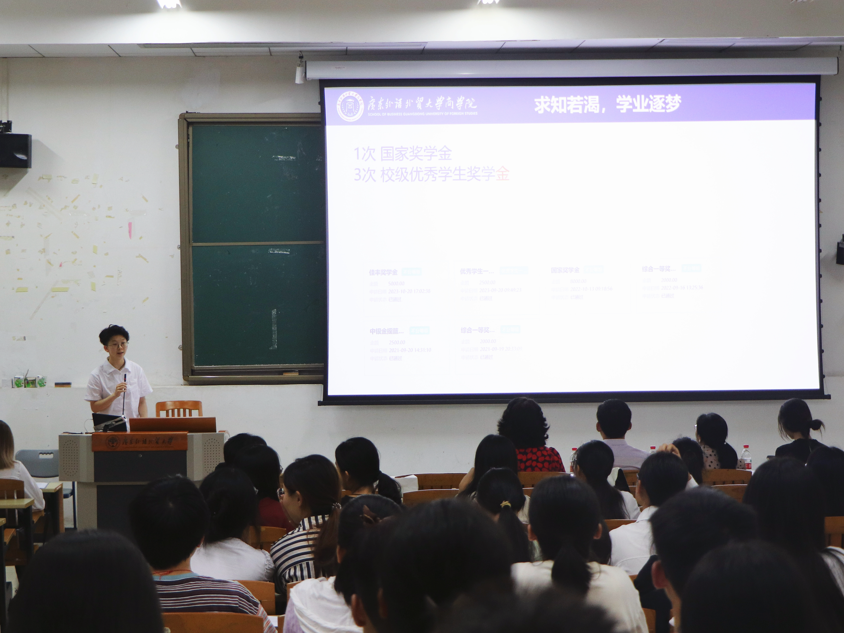 接着,往期优秀学员代表作心得分享。电子商务2002班戴祺鸣分享了她在课程中的学习经历和个人成长。她用四个八字短语概括为:“求知若渴,学业逐梦;行以致远,实战逐梦;外兼内修,生活逐梦;逐梦未来,扬帆起航。” 戴祺鸣表示,通过特色班课程学习到了阿里巴巴国际站店铺基础实操技能,了解了跨境电商B2B行业的人才需求。同时,她也介绍了特色班带来了丰富的学习实践资源,不仅能通过课程和实训锻炼技能,还能在实践活动中获得实习和就业机会。最后,她鼓励大家珍惜机会,活出自己的精彩。