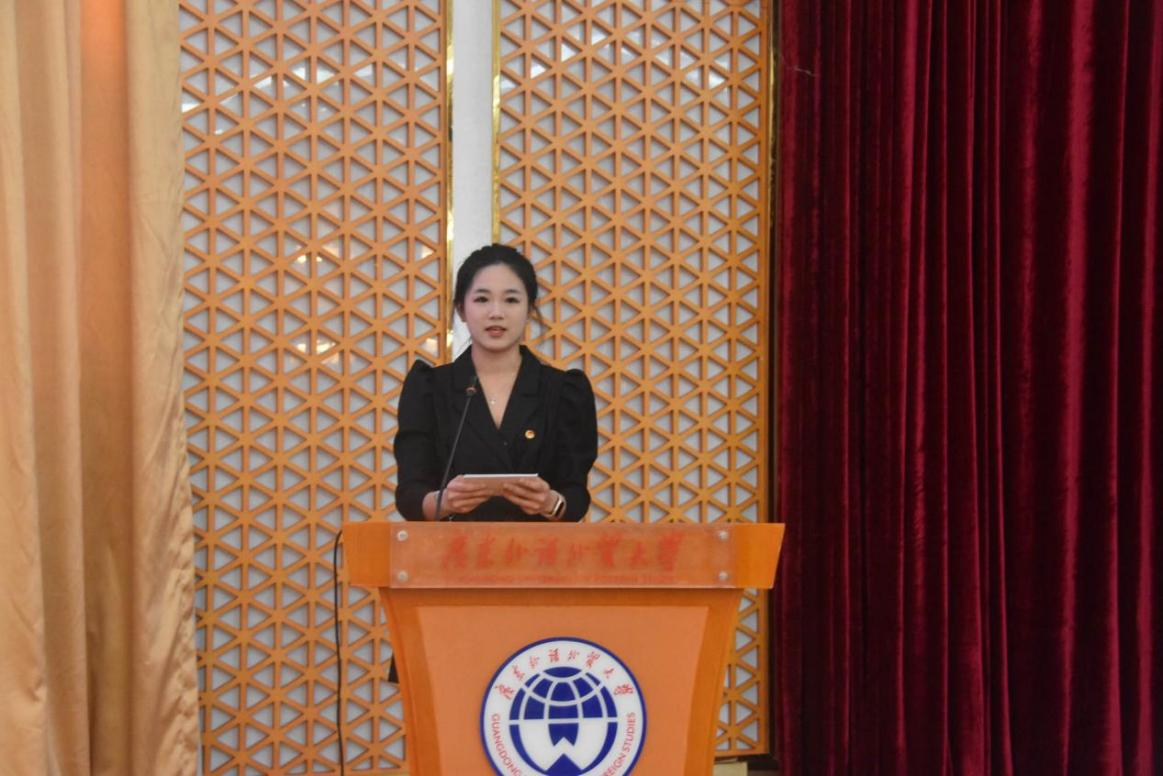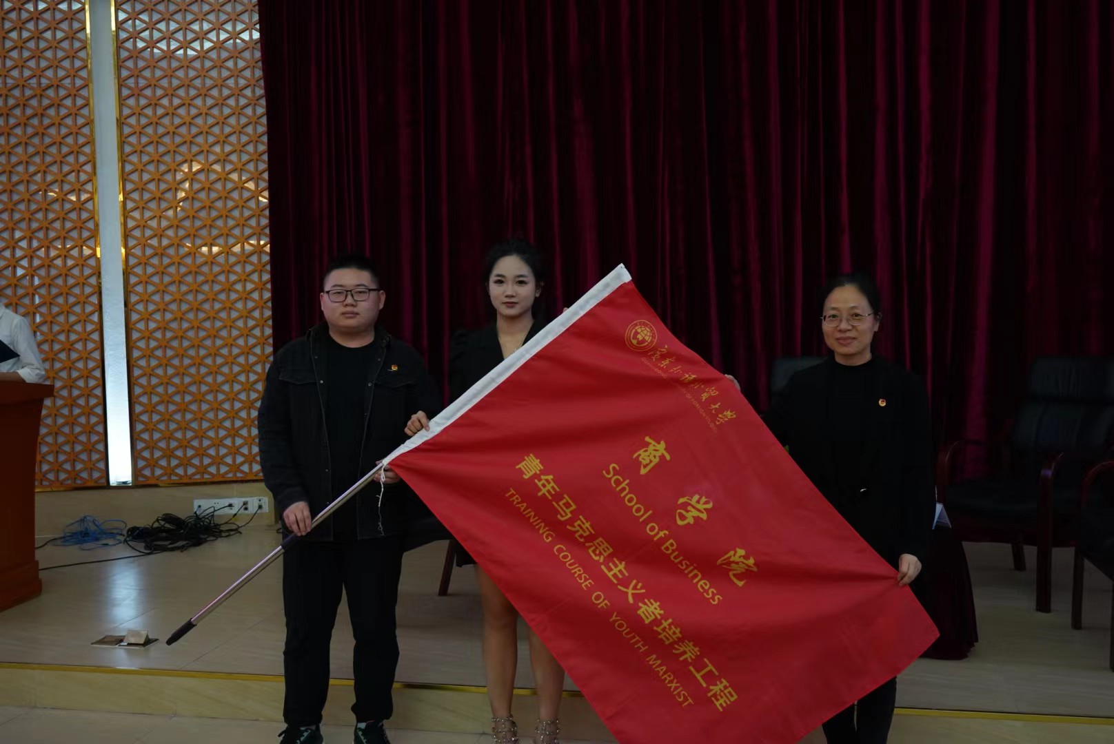 接着,第七期青马班学员代表齐晶莹上台发言,她表达了对青马班的憧憬和向往,明确并强调了身为青马班成员应有的责任与担当。她与全体学员共勉,在之后的学习中共同努力,刻苦钻研,勇于创新,做马克思主义理论的青年实践者,力争成为具有国际化新商科专业素养的青年主力军。