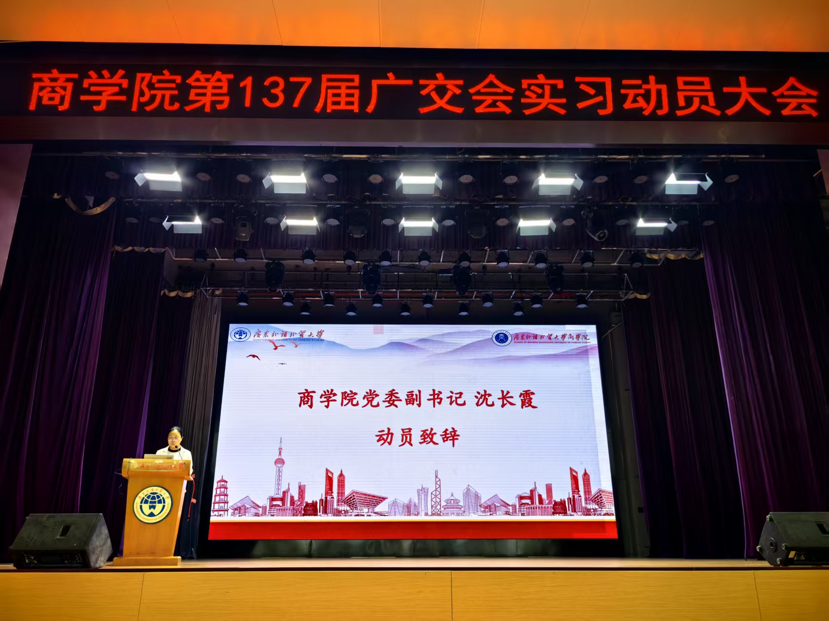 动员会上,刘家俊详细介绍了本次广交会实习的基本情况与实习要求。他强调广交会是同学们了解世界的大舞台,也是步入职场、锤炼技能、实现角色转变的契机。他希望同学们在实习过程中遵守组织纪律、提升服务意识、注意人身安全。135届广交会优秀实习生代表傅琳婷分享了自己在广交会实习的亲身经历。她提醒同学们要认真履行岗位职责、合理规划出行路线、抓住宝贵机会锻炼自己的实践能力。2023级学生代表余慕茜进行了发言,她号召全体实习学生要以最高标准要求自己,准时到岗、规范着装、热情服务,以精益求精的态度认真完成本次实习任务,充分展现商院青年的优良风貌。