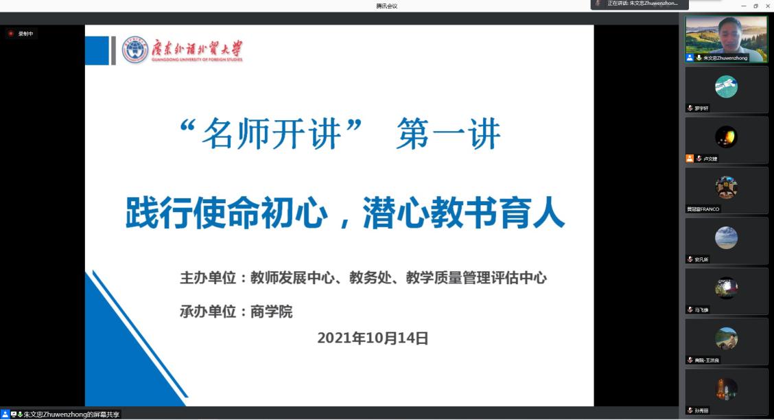 2021年10月14日下午,为充分发挥教学名师和骨干教师的引领作用,进一步提高学院教学质量和水平,bevictor伟德教学质量月系列活动“名师开讲”第一讲于线上顺利开展,本次讲座主题为“践行使命初心,潜心教书育人”,由院长朱文忠担任主讲,学院教师共50余人参加讲座。讲座由教师发展中心梁伟玲老师主持。