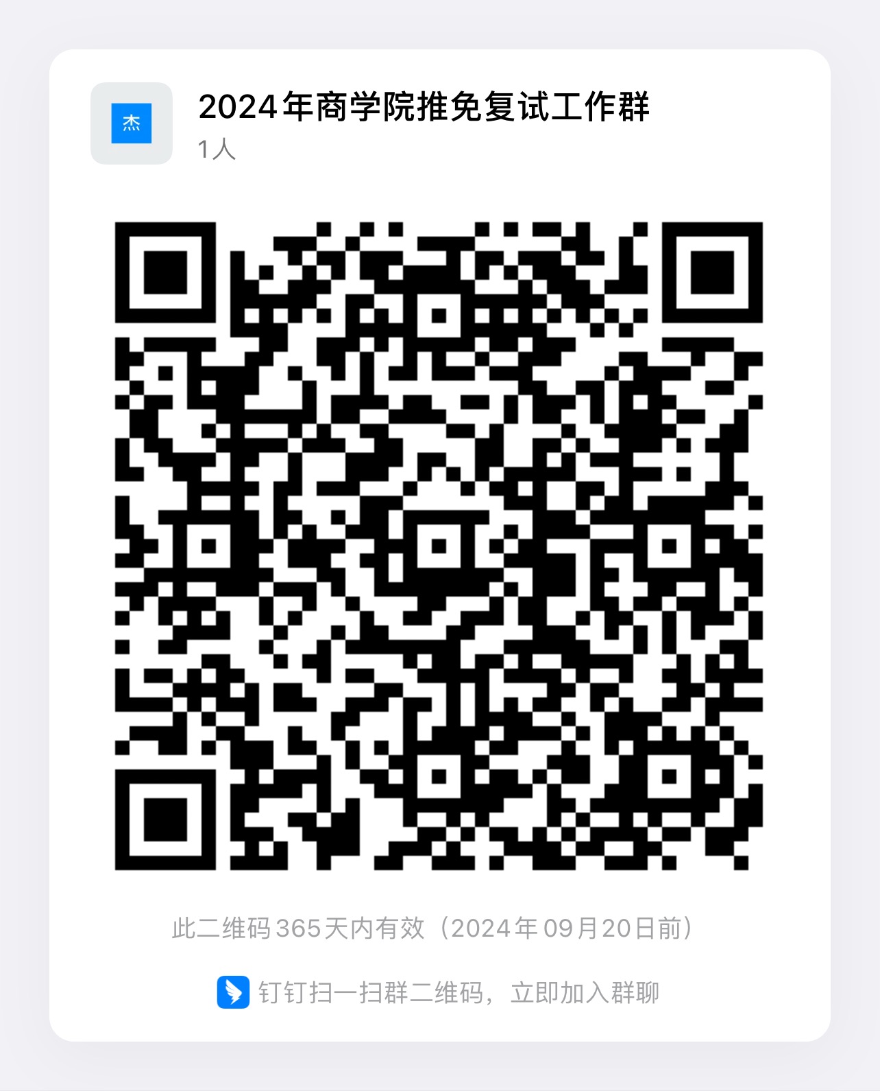 确认参加复试:取得复试资格的考生须于9月21日下午17点前,扫描下方的钉钉群二维码,入群时须发送验证信息: 报考专业名称+姓名,方可通过验证。