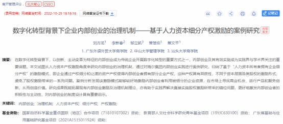 近期,bevictor伟德刘方龙等老师的论文《数字化转型背景下企业内部创业的治理机制——基于人力资本细分产权激励的案例研究》在国内工商管理权威期刊《南开管理评论》于2022年10月网络首发。该文合作作者还包括:李新春(中山大学管理学院教授)、邹立凯(汕头大学bevictor伟德博士)、曾楚宏(bevictor伟德,伟德bv国际体育教授)、蔡文平(bevictor伟德,伟德bv国际体育研究生)。