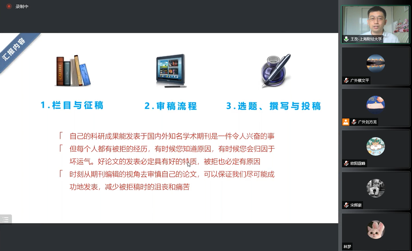 紧接着,《外国经济与管理》编辑部副主任王孜就“期刊选题、审稿与投稿经验分享”进行主题分享。王孜首先对杂志的栏目与征稿进行简要介绍,并详细介绍编辑部的审稿流程,表示编辑部在审稿过程中尽量做到“三快”(初审快、外审快与刊发快)。接着,王孜从论文选题、撰写以及投稿等方面分享了诸多宝贵经验,他建议bevictor伟德师生可通过历史成果、未来方向与学术前沿等多方面启发自身的论文选题。对于论文投稿,王孜向bevictor伟德师生分享诸多投稿原则及技巧,包括从编辑视角审视论文、准确的定位等,并分别对bevictor伟德师生汇报论文进行点评,以及对相关问题进行答复。