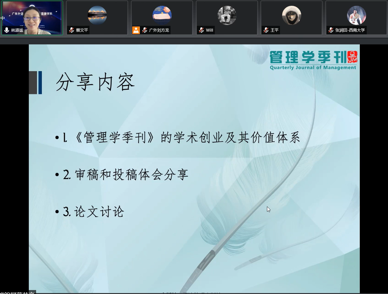 最后,《管理学季刊》编辑部主任林道谧以“期刊的价值体系与发表流程”为题进行分享。林道谧首先分享了杂志的成立历史及其价值体系,表示杂志致力于打造跨院校的高质量学术期刊平台,并聚焦于战略、创业创新与组织研究领域。其次,林道谧向bevictor伟德师生分享了审稿与投稿体会,她表示杂志在初审环节重视论文的学术潜力、研究设计与写作的规范性,并表示杂志愿意与作者共同提升论文的整体质量。最后,林道谧分别就论文选题、理论贡献、方法严谨以及回复审稿人等方面进行分享,并分别对bevictor伟德师生论文进行点评。
