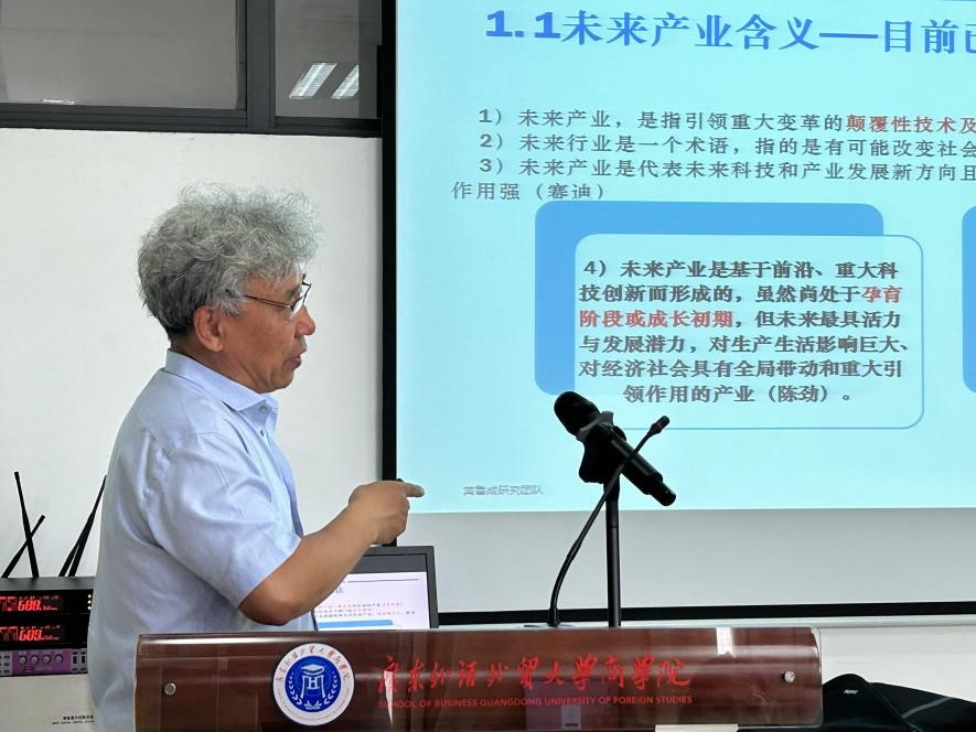 首先,曾楚宏副院长对黄教授的到来表示热烈的欢迎和衷心的感谢。随后,黄教授为我们深入解读了未来产业的含义、特征以及选择。未来产业,是指那些引领重大变革的颠覆性技术及其所创造的新产品、新业态,它可能改变社会和经济各个部门的技术领域。这些产业具有巨大的市场潜力和强大的带动作用,它们与战略性新兴产业既有相同点,也有不同之处。