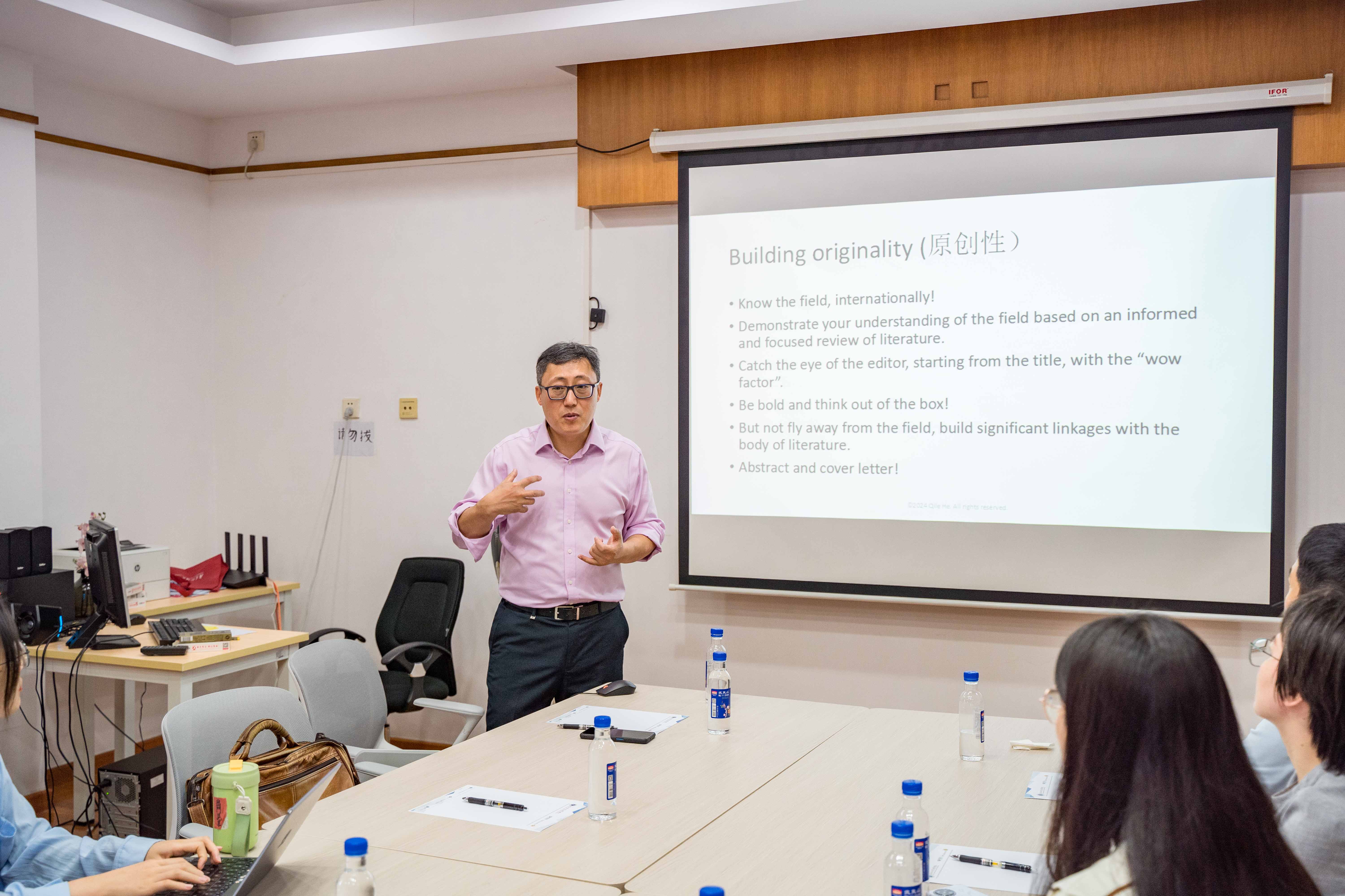 在谈到论文的原创性时,何教授提出了自己的独到见解。他认为,原创性的基础是对研究领域的深刻理解。研究者需要在广泛文献回顾的基础上,展示自己对该领域的洞察力,并能够吸引编辑的注意。同时,他鼓励研究者要敢于跳出传统思维的框架,但又要确保不偏离研究的核心领域。何教授还分享了如何讲述一个引人入胜的研究故事。他建议研究者从读者的角度出发,选择一个吸引人的主题,并以清晰、简洁的方式讲述,就像给一个小孩讲故事一样,让复杂的研究变得生动有趣。在研讨会的最后,何教授分享了他对于科研态度的看法。他强调,科研工作者应该积极与他人合作,避免闭门造车。同时,他也提醒在座的学者们要做好面对拒绝的准备,因为即使是最优秀的作品也可能遭遇拒绝。他鼓励大家在面对挫折时不要气馁,而是要坚持不懈,继续追求学术上的卓越。