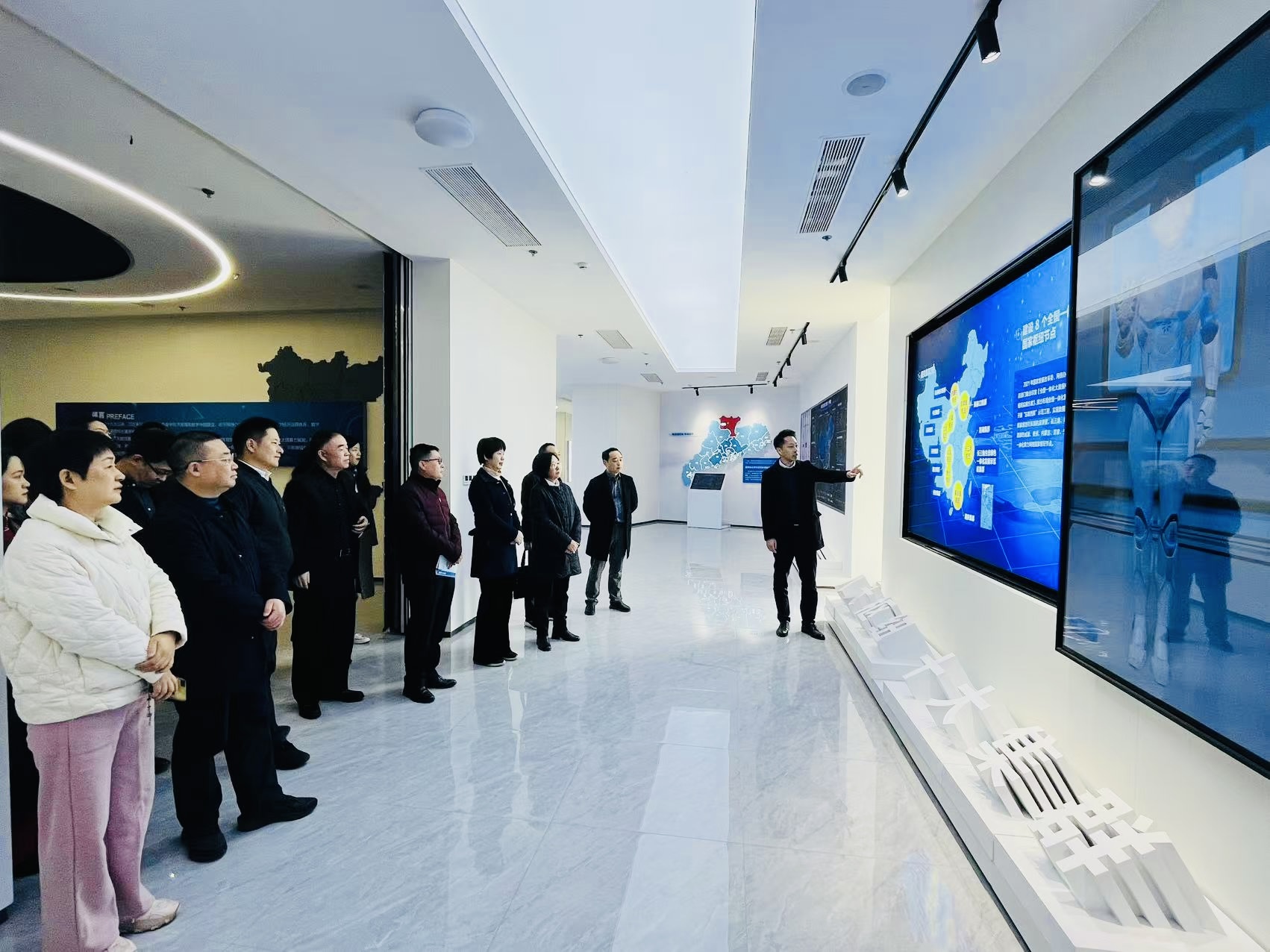 在粤港澳大湾区数据应用产业园校地一行参观了产业园的数据展厅,了解了园区以数据应用为核心驱动力,致力于构建一个集大数据多元化功能与广泛业务范畴于一体的大数据特色产业园的发展历程。通过文字材料和视频展示,大家深入感受到科技发展带来的日新月异以及大数据技术在推动产业升级、促进经济社会发展中的重要作用。
