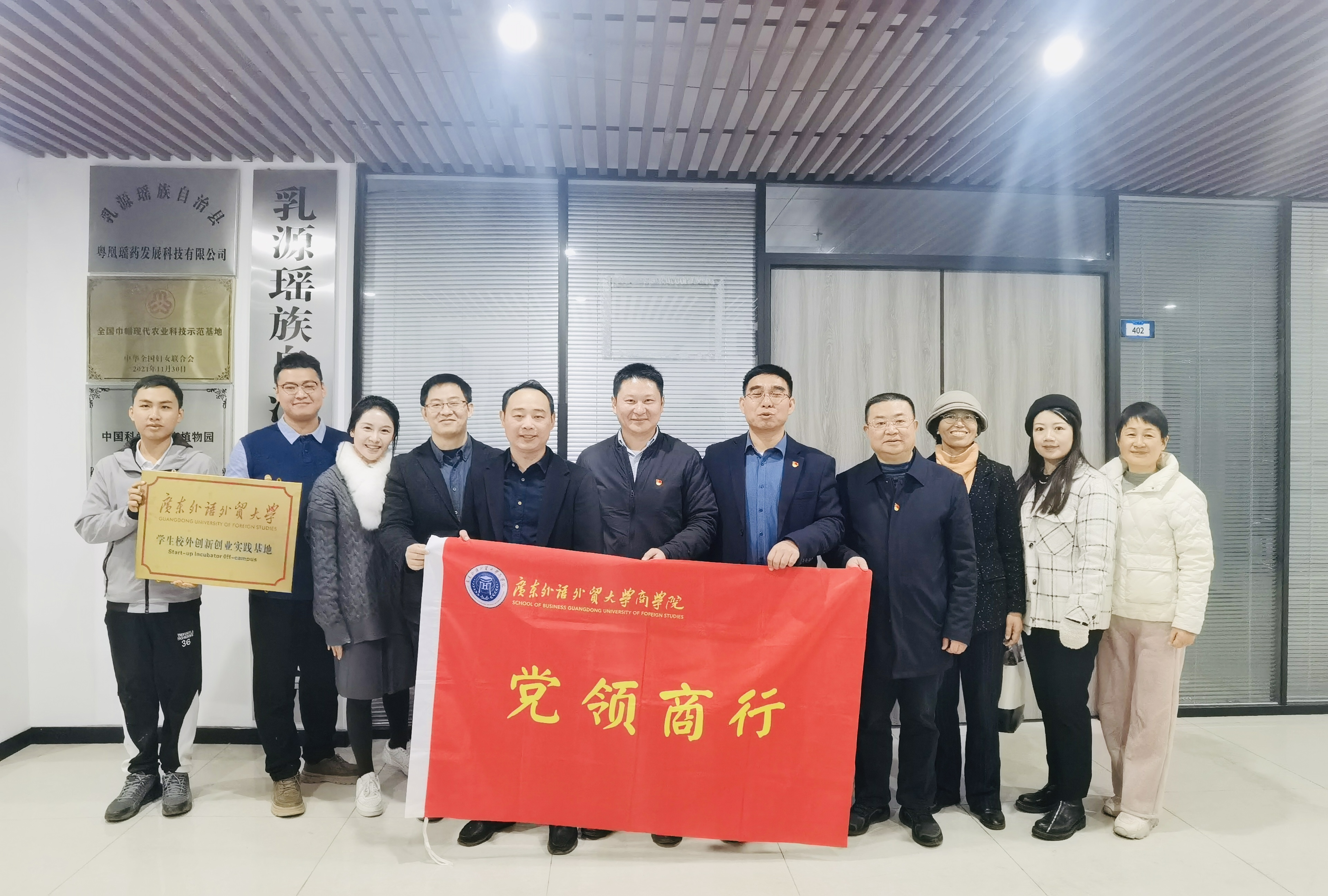 座谈会后,师生党员一行前往韶关市乳源粤凰瑶药发展科技有限公司的瑶药驯化与应用基地实地调研瑶药驯化情况和为村民增收的应用前景,在广科乳源产业创新园参观交流并举行实践基地合作签约暨授牌仪式。公司管理层黄明亮介绍了中药材—金毛狗蕨项目的运营现状、合作模式及未来发展,双方就人才培养、共商共研等事宜展开了深入调研交流。公司负责人陈小凤长期钻研瑶药驯化项目,聚焦将属于国家保护野生植物的中药材驯化并为药企提供原材料,通过创新创业支持乡村振兴。bevictor伟德、区域国别学院和韶关校友会的共同见证下,刘方龙和黄明亮分别代表校企双方签订了“学生校外创新创业实践基地”合作协议肖锋代表创新创业学院向韶关市乳源粤凰瑶药发展科技有限公司授予“学生校外创新创业实践基地”牌匾。