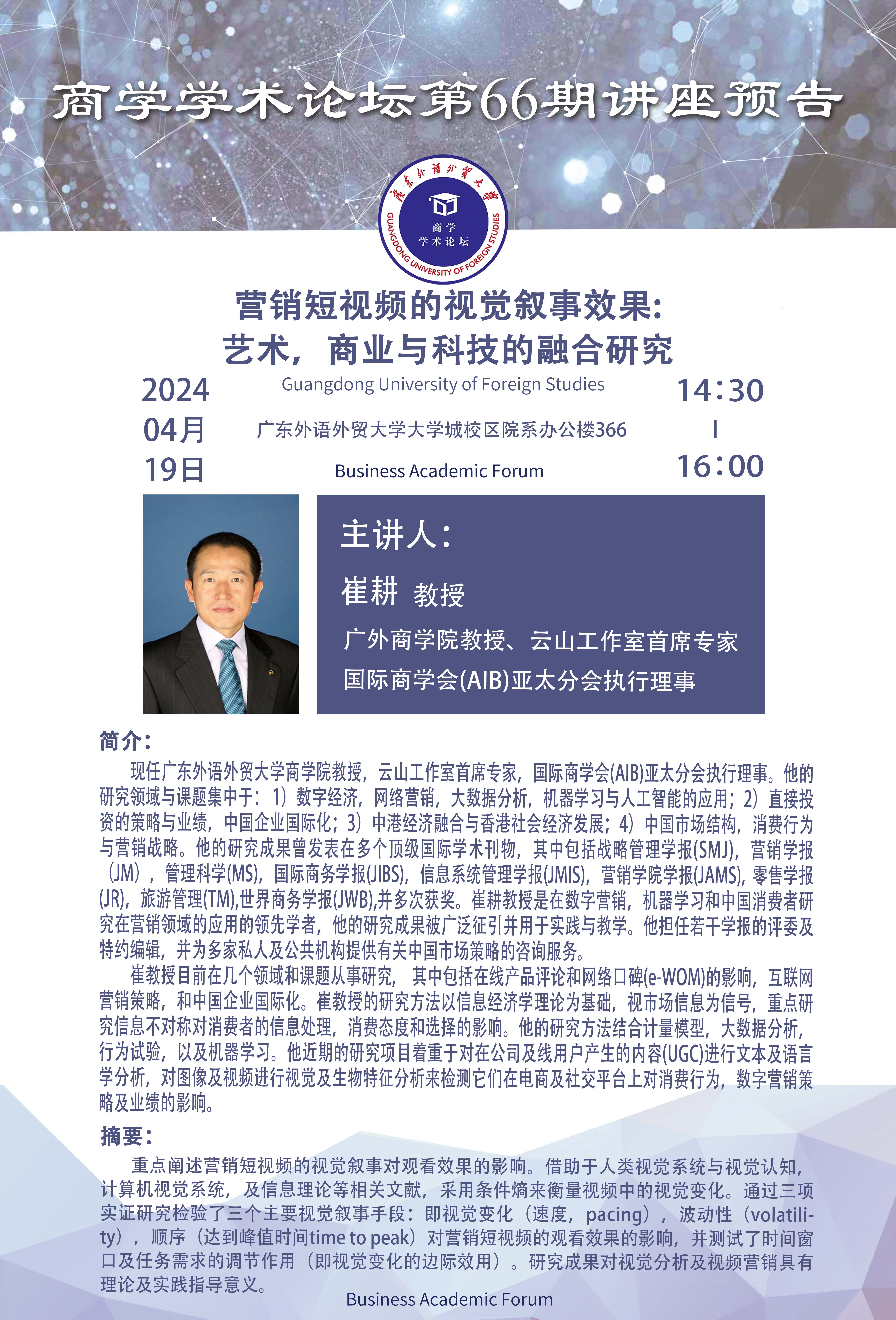 商学学术论坛第66期讲座预告 营销短视频的视觉叙事效果:艺术,商业与科技的融合研究