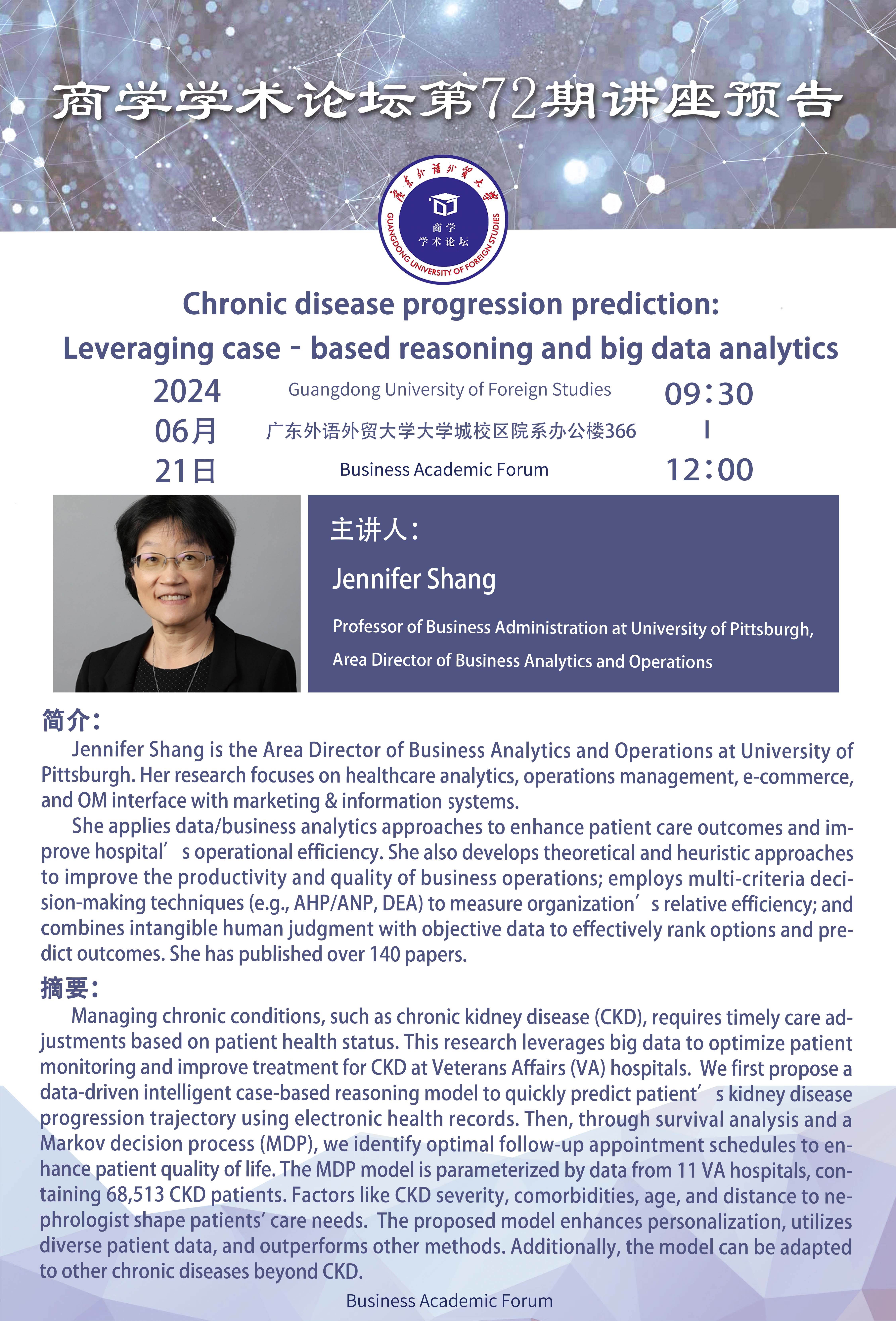 商学学术论坛第72期讲座预告 Chronic disease progression prediction: Leveraging case‐based reasoning and big data analytics