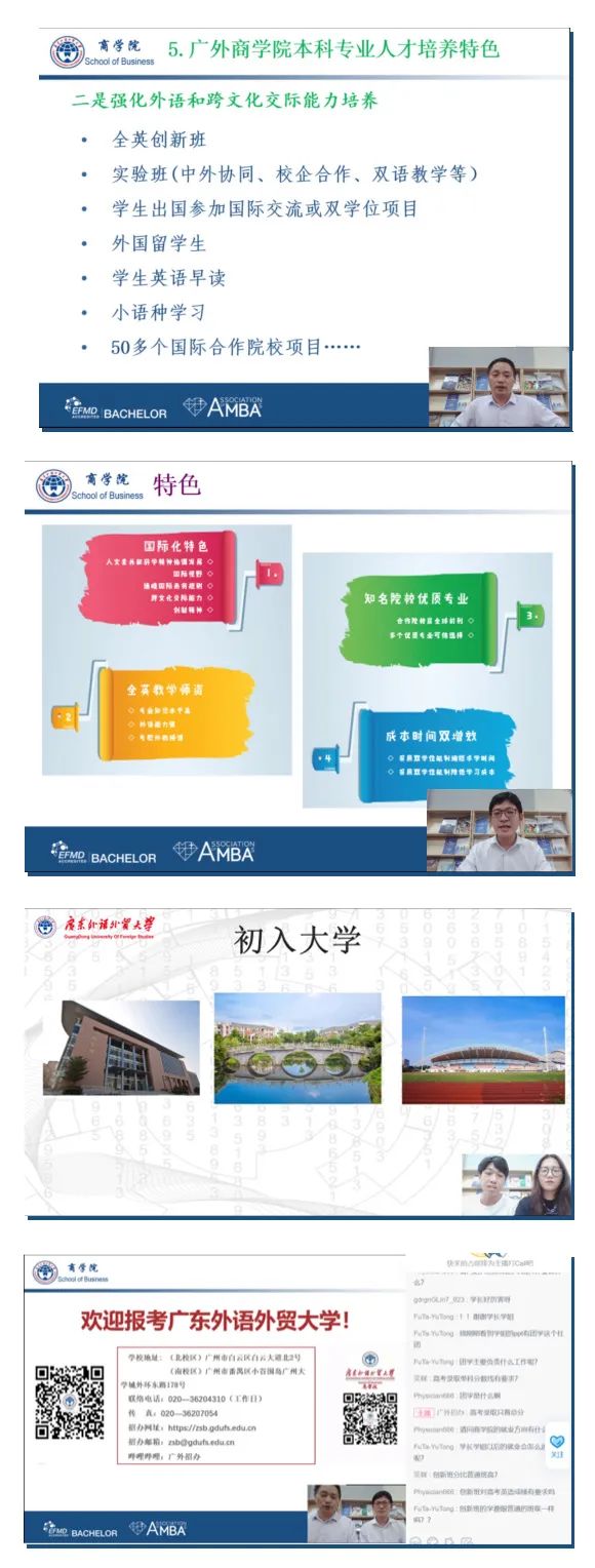 在直播中,院长朱文忠首先强调了学院的国际化特色定位和国际高端商科人才培养理念,然后着重介绍了学院的人才培养模式、培养理念和培养成效;副院长丁浩对2个全英国际创新班及全英教学部进行补充介绍;招生宣传大使官超、叶思华同学分享了在校的成长经历;黄冠富、卢文婕老师和招生宣传中心助理们精心配合现场安排。